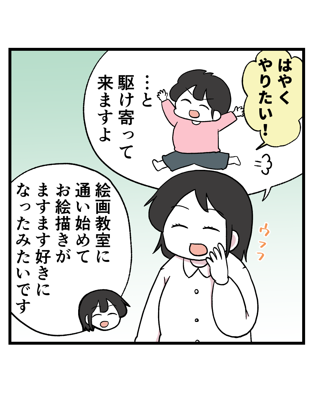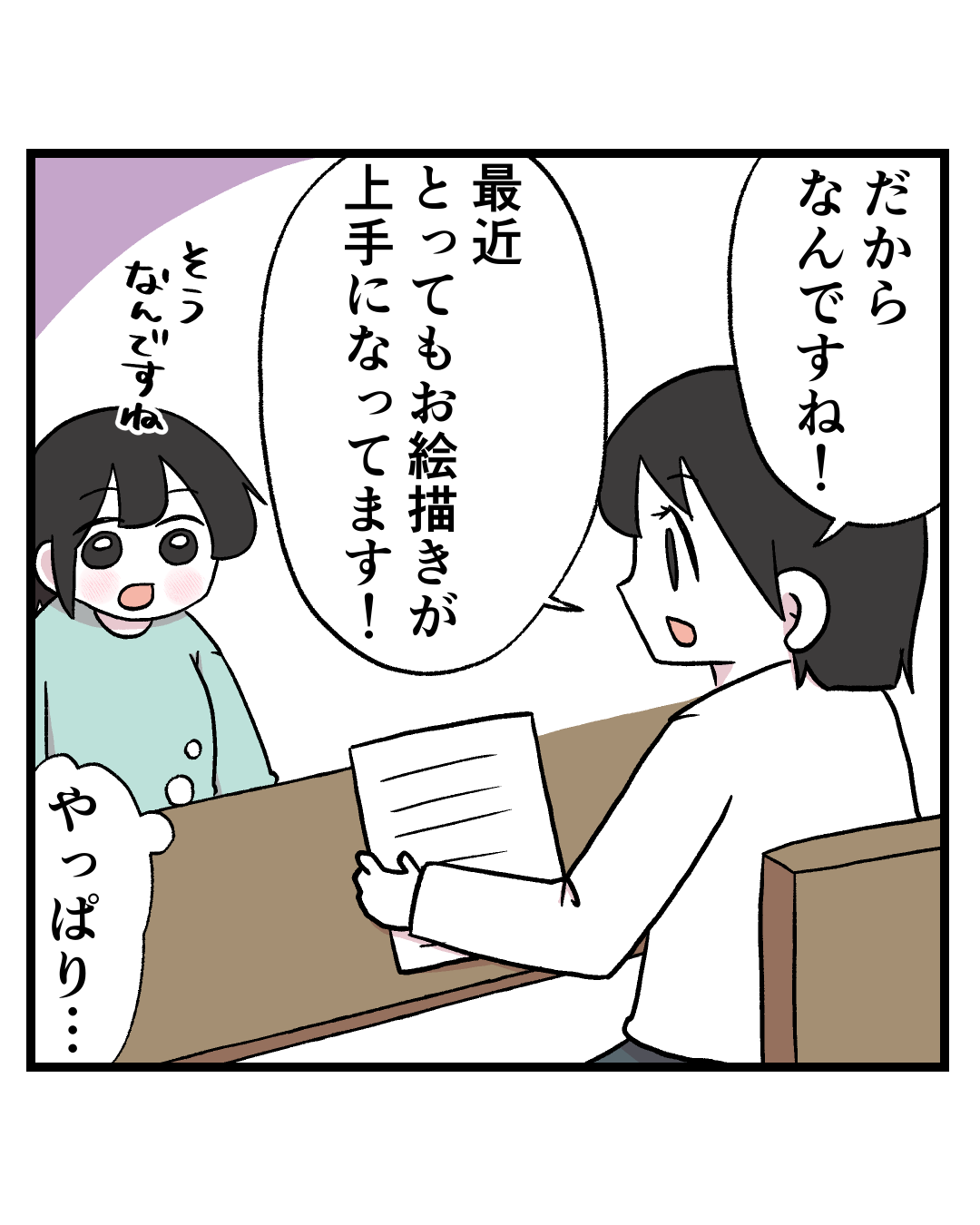 今まで保育園の面談でお絵描きや工作について褒めていただくことはなかったのですが、お絵描き教室に行ってからますますお絵描きが好きになったようで、園でも積極的に創作活動をしているそうです🤭